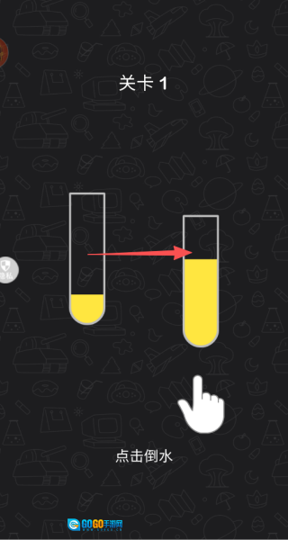 1、游戏开始时,首先要辨别出颜色相同的液体,就像图里那两支装有黄色液体的试管一样。接着按照提示,先点击其中一支盛有黄色液体的试管,再点击另一支颜色相同的试管,完成液体倾倒操作即可过关。