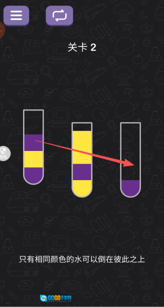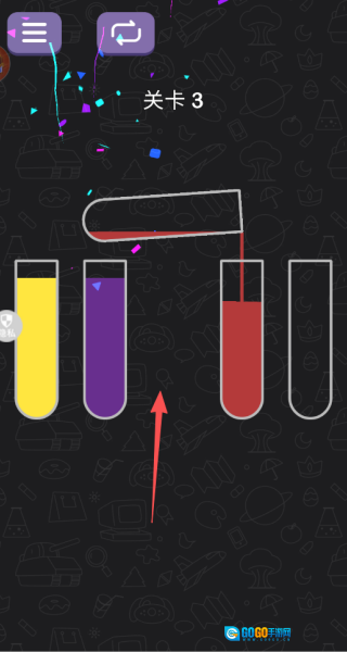 2、先点击盛有目标颜色液体的试管,接着点击另一支满足顶部颜色相同或为空且有剩余空间条件的可承接试管,即可完成液体的倾倒转移操作。