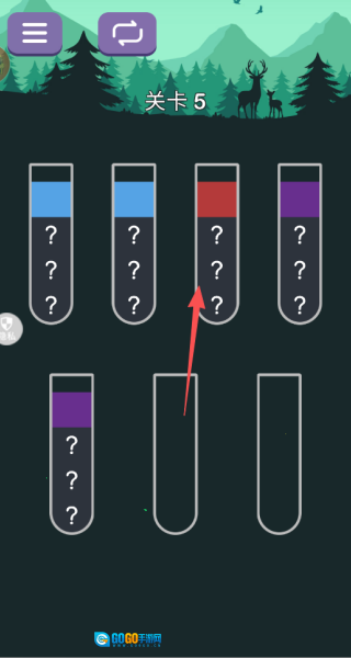 4、当碰到带有“?”标识的未知液体试管时,应优先对顶部颜色清晰的试管进行处理,把它们和顶部颜色相同的试管对应起来进行倾倒操作,从而逐步弄清楚未知液体的具体颜色。