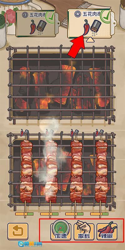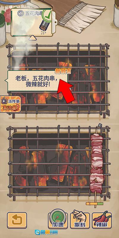 2、接下来我们点击后面的烧烤原材料,把它放到烧烤台上,再按照顾客的要求给它加辣、加调味料。