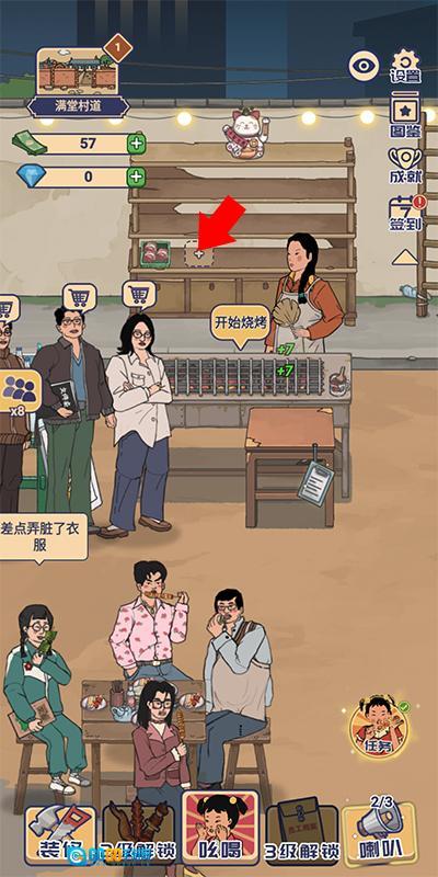 1、打开后能看到烧烤摊前有顾客前来,我们要先点击顾客头顶的购物车图标,引导他们入座。