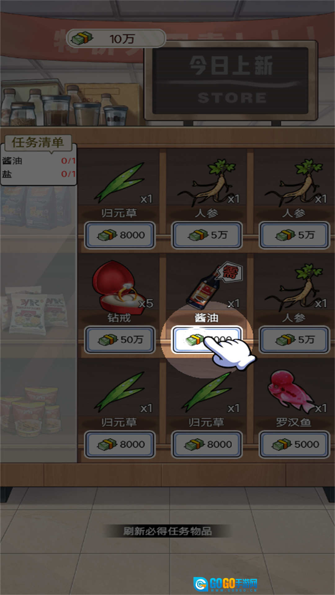 1、完成购物任务清单里的各项任务,借助刷新机制来获取需要的物品,逐步积累资源。