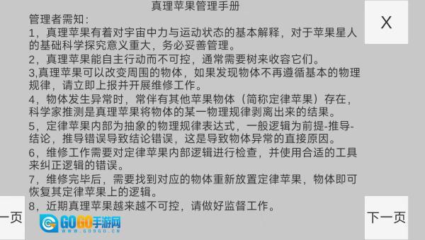 2、要牢记真理苹果管理手册中的各项规则,一旦察觉有物体不符合物理规律,就应当判定其属于定律苹果异常情况。