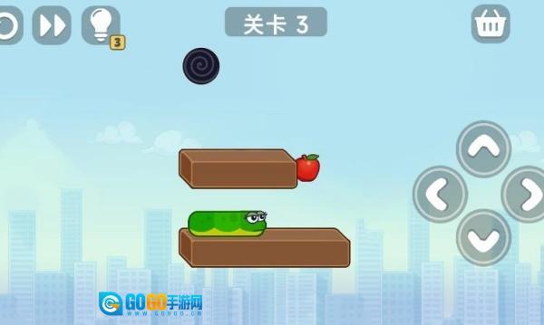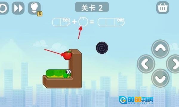3、控制小蛇向右移动到平台的边缘位置,接着向上移动至上方的平台,靠近并吃掉苹果,随后继续向上移动,抵达黑色漩涡处,以此完成关卡3的通关任务。