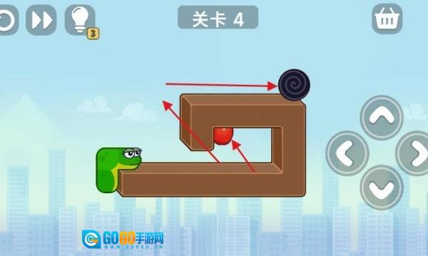 4、操控小蛇向右移动,顺着通道的路径前进,先靠近并吃掉红色苹果,接着继续向右移动到通道的尽头,到达黑色漩涡的位置,就能完成关卡4的挑战。