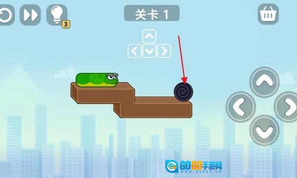1、控制小蛇向右移动,到达黑色漩涡所在的平台区域,靠近漩涡就能触发通关条件,完成关卡1的挑战。