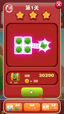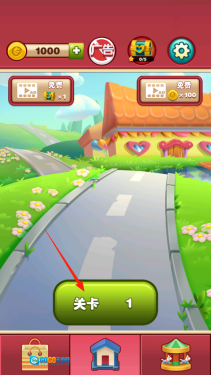 1、进入游戏主界面后,找到标有关卡1的按钮,点击它就能进入第一关。界面上方虽然有金币、广告、宝箱之类的功能,但暂时不用理会,先专注点击关卡按钮开始游戏,看看第一关该如何消除方块。