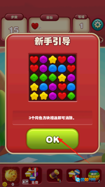 2、启动新手引导后,会弹出提示框说明3个同色方块相连即可消除,点击OK确认;接着在下方的方块堆中找到同色方块,通过交换位置使其相连完成消除,以此熟悉游戏规则。