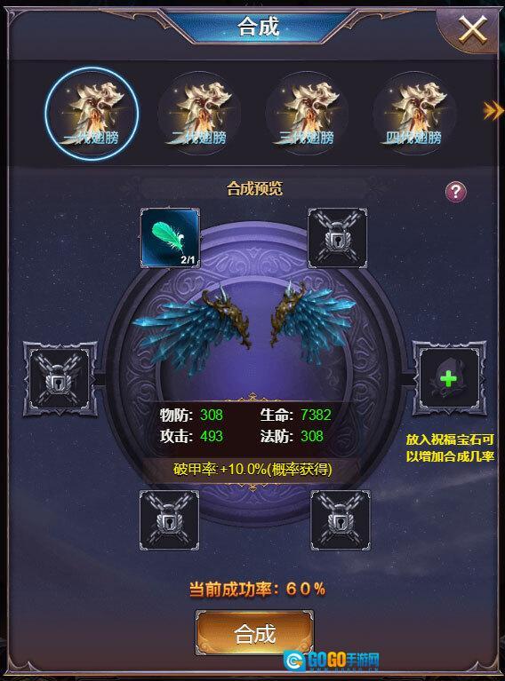 3、翅膀合成:凑齐合成所需的材料就能合成更高级的翅膀,若放入祝福宝石,还能提升合成的成功率。
