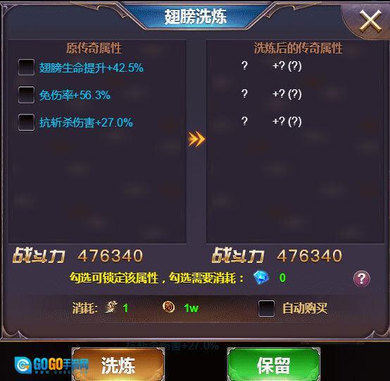2、翅膀洗练:翅膀的传奇属性可通过消耗洗练精魄进行洗练。