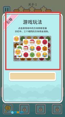 1、点击“开始游戏”按钮进入关卡,把三个相同表情的方块移动到展示栏中,通过消除方块获取分数,努力达成满星通关的目标。