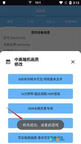 4、点击“一键打开”后再选择画质,系统会自动完成修改;修改成功后,只需重启设备就能畅快游玩了。