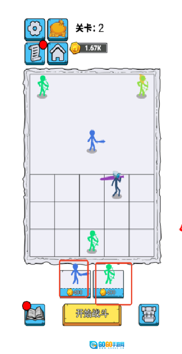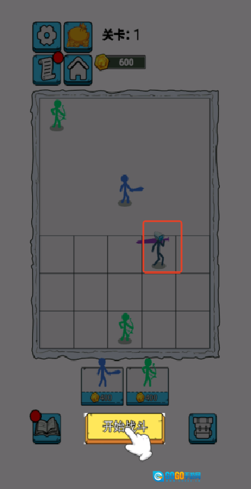 1、启动游戏后,点击挑选火柴人开启对战,通过合成两个火柴人可提升战斗力。