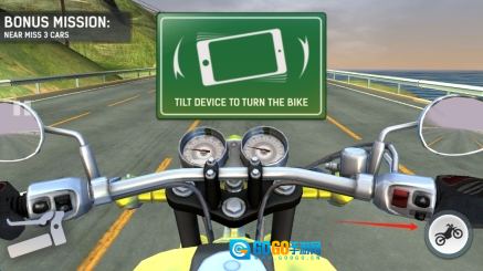 3、在驾驶界面,根据“TILT-DEVICE-TO-TURN-THE-BIKE”的提示,通过倾斜设备来控制车辆转弯,完成近距离避让3辆车的任务。