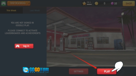 2、在加油站场景界面中,点击PLAY按钮即可开启摩托竞速挑战,进入游戏驾驶环节,随后点击进入游戏。
