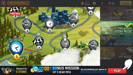1、在地图关卡界面中,选择带有时钟标识的关卡1,同时注意查看FREE-BIKE和BONUS-MISSION相关内容,然后点击进入该关卡。