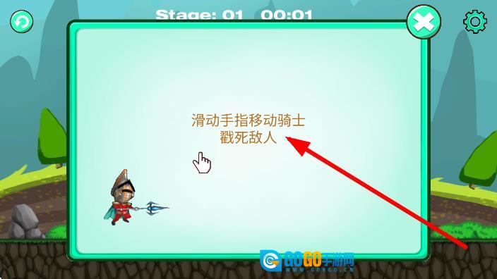 2、处于Stage:01阶段时,按照“滑动手指移动骑士戳死敌人”的提示操作,通过滑动屏幕来控制骑士的移动方向,对准敌人后发起攻击。