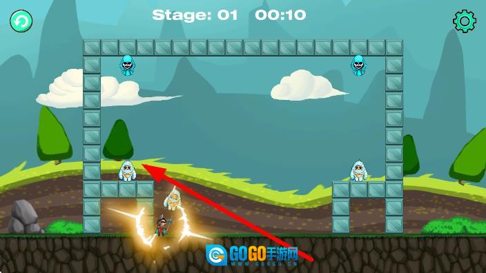 3、按照箭头指示的方向,操控骑士跨越障碍,对蓝色与白色的敌人发起攻击;同时留意剩余时间,加快推进节奏,顺利完成Stage:01关卡。