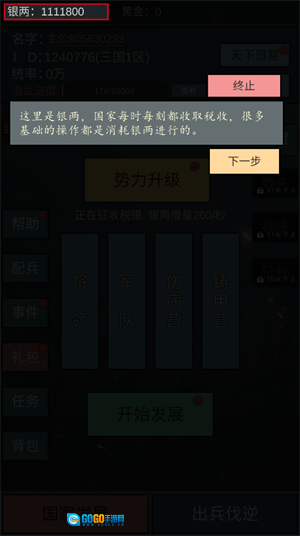 1、这里是银两,国家会持续不断地征收税收,不少基础操作都需要消耗银两来完成。