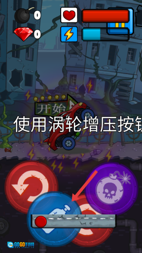 游戏开始后,要点击下方的蓝色涡轮增压按钮,助力我们的红色赛车迅速启动,以应对初始路段的挑战。