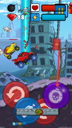 3、要是在前进过程中遇到阻碍或是被其他选手干扰,你可以点击紫色炸弹按钮发起攻击,清除这些障碍后就能继续前行了。
